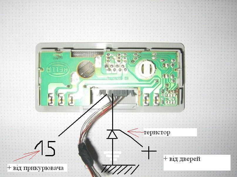 Світло вимикається одразу, проводка оригінальна, фото плафона не моє - в мене лампочка, а так все один в один - в мене один контакт на лампочці - постійний мінус, інший контакт лампочки плюс з дверей - на лампочці, та постійний плюс який перемикається нахилом самого плафона (скла), тобто при відкритих дверях - завжди світиться, при закритих - можна включити.Виключити при відкритих дверях - неможливо! що і заставило взятись за ці плафони.