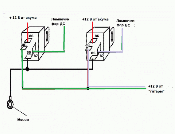 Значит на 30 подаем питание от акума, а на 86 провода от гитары ? Так?