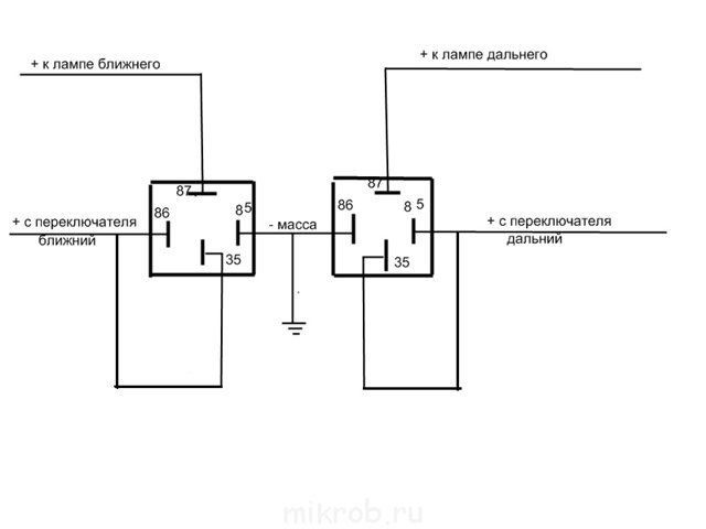 Немного коммента. Прогуглив и изучив эту тему, выяснил, что контакты 85 и 86 катушка, которая находясь под напряжением создает магнитное поле (типа того) (да и на реле есть схема). А контакты 30 и 87 управляющие, то есть на 30 появляется питание, например включаем на подрулевом ближний свет замыкается 87 контакт и горит ближний свет.