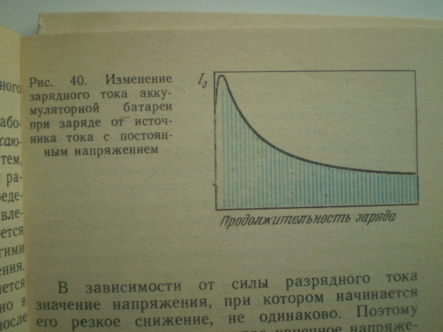 В автомобиле заряд происходит при постоянном напряжении(см. картинку внизу), ток при этом изменяет значение от максимального, определяемого состоянием и степенью разряда АКБ после пуска и это очень хорошо было видно в Москвичах и Волгах с остальными УАЗами и проч.- стрелка амперметра постепенно от какого-то значения тока падала к минимуму, достаточному для заряда батареи. Сейчас амперметров нет, смотреть нет на что.