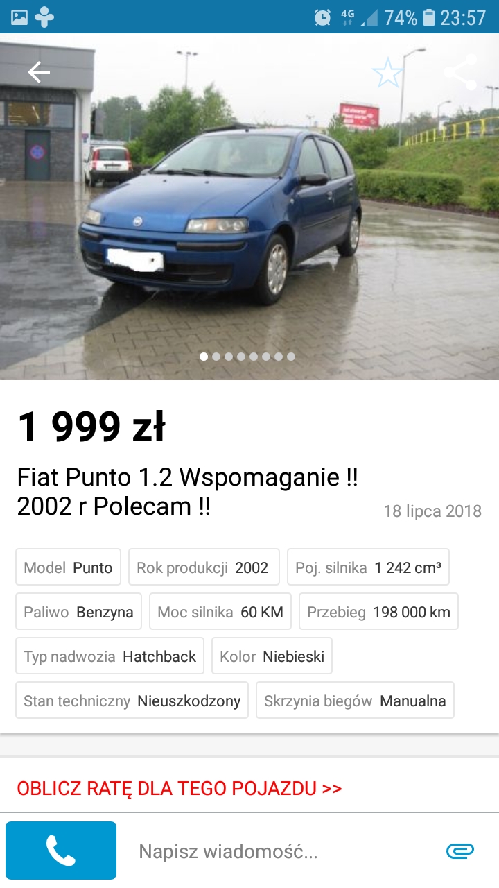 неспішно продам фіат пунто 2002 рік 1.2. 16 клапанів-машина моя їздив по польщі зараз на україні. при потребі можу дати доручення. машина на польських номерах. пробіг 127 тисяч оригінал що видно по стану мотора. потрібно перекрасити крило і дві дверки. я їх замінив по рідні були пропороті попереднею власницею. краска вже куплена. підвіску зробив. залишилось на днях поставити нові аморти перед і все. ціна 1500 у.о без торгу і рік катаєтеся. продажа не спішна сам їзджу кожен день бо економна і прикольна машинка. вид зовні не дороблюю бо мені на нього побарабану я в салоні сижу))))) продається на бляхах 14 ках.