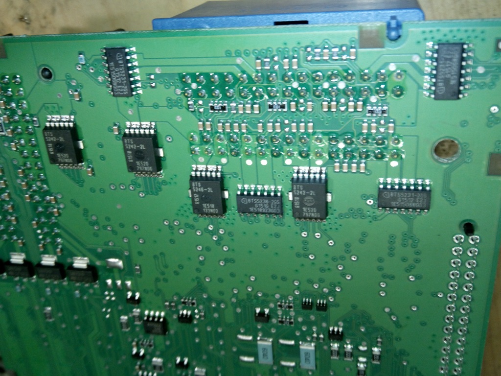Итак. Где-то внутри -- микроконтроллер. Но то что нам больше всего нужно -- релюшки и электронные силовые ключи -- вроде как на поверхности. Явно видны микросхемы "BTS5231", "BTS5236", "BTS5242", "BTS5246" -- все они легко гуглятся. Каждая из них -- это двухканальный "интеллектуальный выключатель" на MOSFET, верхнее плечо. И содержат те самые детекторы "неправильности" нагрузок, которые нам необходимо задушить.