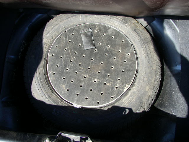 И исчо одно.Но сначала преамбула. Не часто,но проходится доставать домкрат,причем даже не для смены колеса.И каждый раз вынимать колесо...Я его перевернул,закремил болтом покороче,все лахи- в мешок,а сверху все крышкой из первой попавшейся хванёры толщ. 10 мм. Сегодня доставал домкрат без мата...