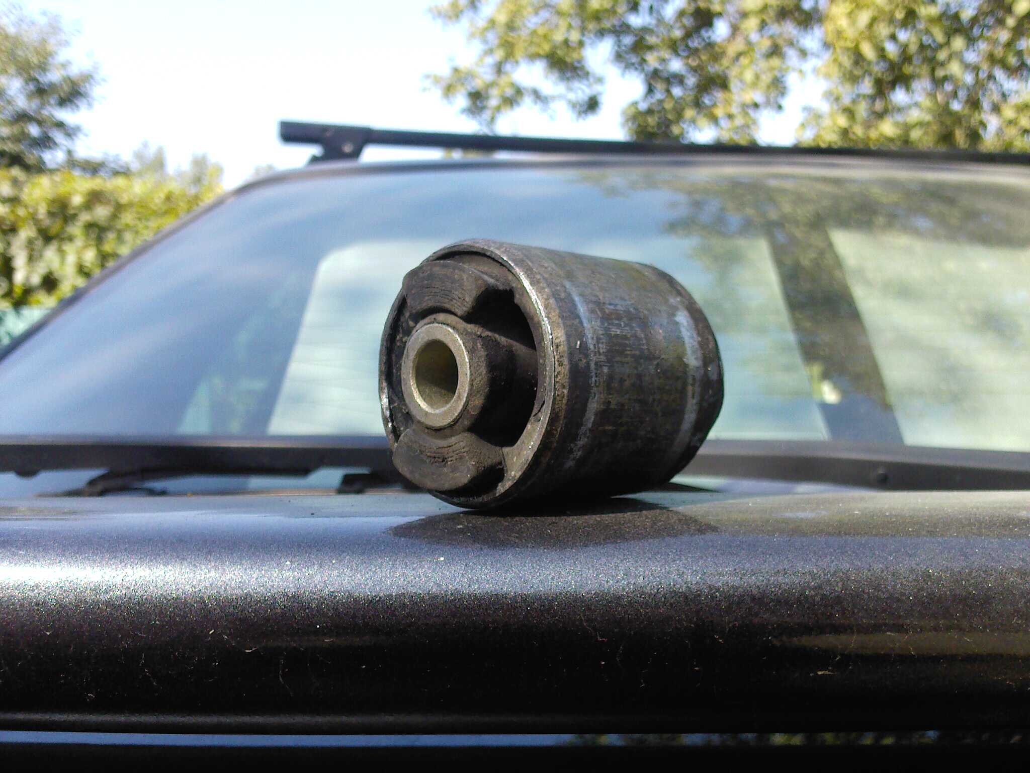 Загремела задница, вот я как бравый хлопец полез смотреть, сайленблоки, поперечной тяги(балки), ага (из опыта знаю луше на рынок тянутся со старыми как образец, бо патом замучеешси менять...), вощем разабрал, выпресовал, в руках аказались по 2 одинаковых сайленблока, поменьше (были выпресованы непосредственно из ступицы) и побольше (соответственно из самой балки), маленькие искать непришлось, в гораже валялись от старай джиги, нашол их, перемерял, 1 к 1 ... почти, наружный чууууть-чууть несовпал, за пузырь токарь знакомый подогнал к нужному размерчику и о чудо новые сайленблоки на месте,а вот с большими началось самае тикавае.... :