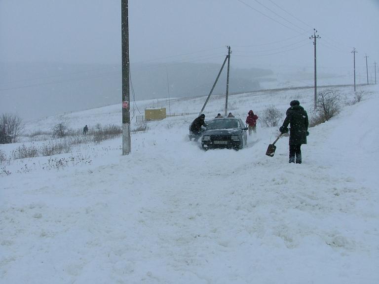 Поехал на выходных к бабушке в село. В суботу снег не падал - но был очень сильный ветер и с полей на дорогу надувало очень много снега. Потом целую ночь падал снег + ветер. И целое воскресенье тоже падал снег + ветерь. В деревню никакой грейдер не ездит и никогда не ездил. В 12 чесов дня я собрался домой. А чтобы выехать из села нужно проехать горку гдето градусов 60 к томуже с поворотами. Сверху снег, под снегом льод.