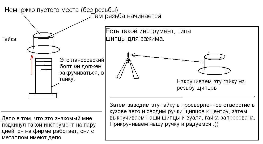 | Александр Т. писал(а): | | Helpix писал(а): | | А у меня с ланоса стоят ручки везде и пассажирам держаться и на двери сдвижной! Только не все тако просто, нужно в отверстия гайку (резьбу) заспринцевать или как это, ну короче что-то типа заклепки, а внутри резьба для ланосовских болтов и будет вам счастье | РАСПИШИТЕ ПЛИЗ, ПОПОДРОБНЕЕ,ЧЕГО И КАК !!! КАК И ИЗ ЧЕГО ЗАКЛЁПКИ ... |