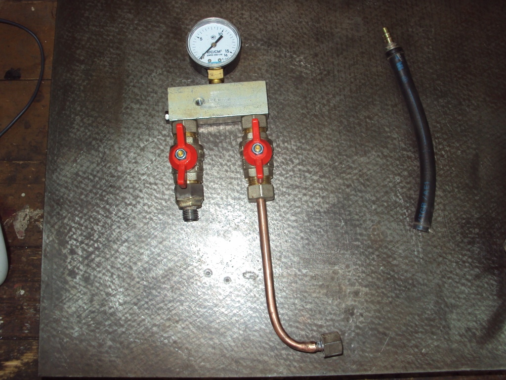 Изготовил приспособу для проверки давления бенза. Кран слева проверяет работу регулятора, а так же герметичность регулятора и форсунок. Кран справа (с медной трубкой) проверяет давление, которое способен создать насос.