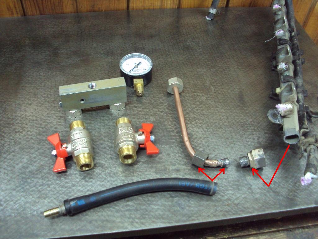 Для изготовления пришлось пожертвовать запасной рампой форсунок и запасным шлангом подключения к рампе. От шланга взяты накидная гайка и штуцер, от рампы- отпилена ответная часть штуцера.