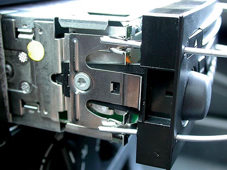 В двох верхніх кутах панелі магнітофону є отвори - в них вставити, наприклад, два шестигранні "Г-подібні" ключики або під зірочку і натиснути, щоб фіксатори відійшли всередину - і потихеньку витягнути магнітофон.