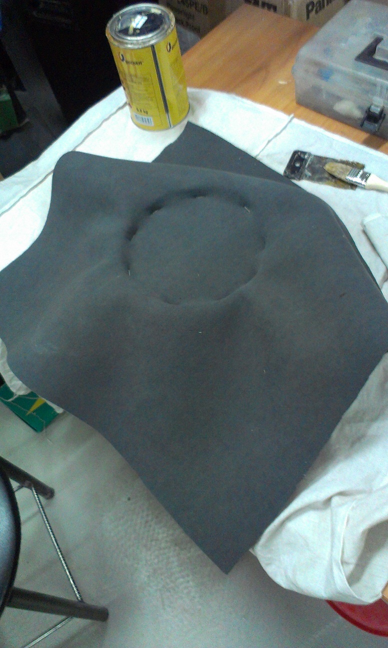 На 2 форме использовал плетеное стекловолокно(типа карбона зачязано), что дало возможность слепить форму за 1 пресет. в 1 слой получилось ровнее, красивее, и достаточно прочно. Кстати лепилось все на обычную футболку из секонда, натянутую и схваченую степлером.