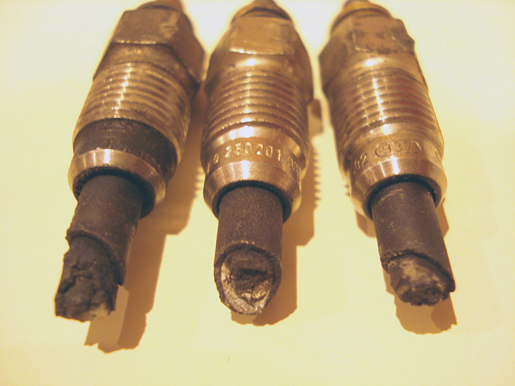 Насчёт форсунок, когда форсы на дизеле (старого типа) начинают лить, то это грозит прогаром вихревых камер (форкамер) и последующим прогаром поршней. В этом случае факел форсунки работает как автоген. Причём заводится двигатель в большинстве случаев будет отлично, естественно при рабочих свечах накала. А распылители (форсунки) полагается проверять через 50 - 60 тысяч (срок их работы) и неисправные заменять. Так что свечи накала льющие форсы сжигают на раз, судя по фото что и произошло. _________________