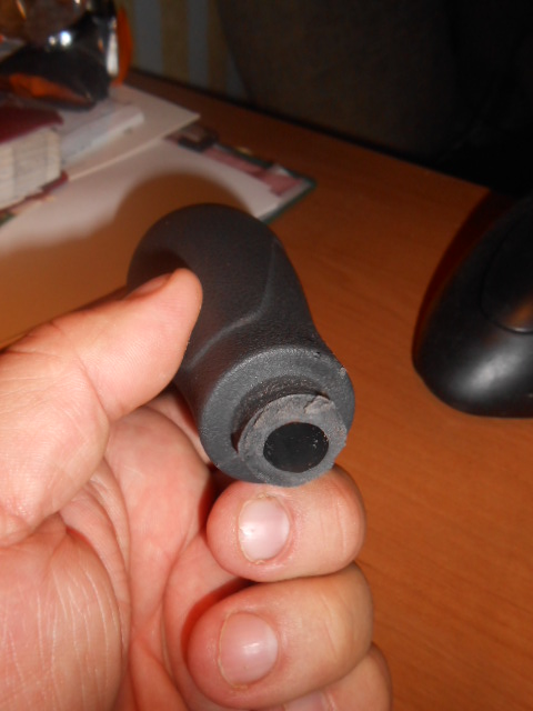 Так как я купил универсальный набалдашник, то он не имел того фиксатора кожаной гофры, который отламался у штатной снизу. Поэтому, для того, чтобы кожаный гофр держался наверху "ручки" и не потерял форму, маэстро "наколхозил" - надел на ручку поролоновую трубку и примотал её изолентой...