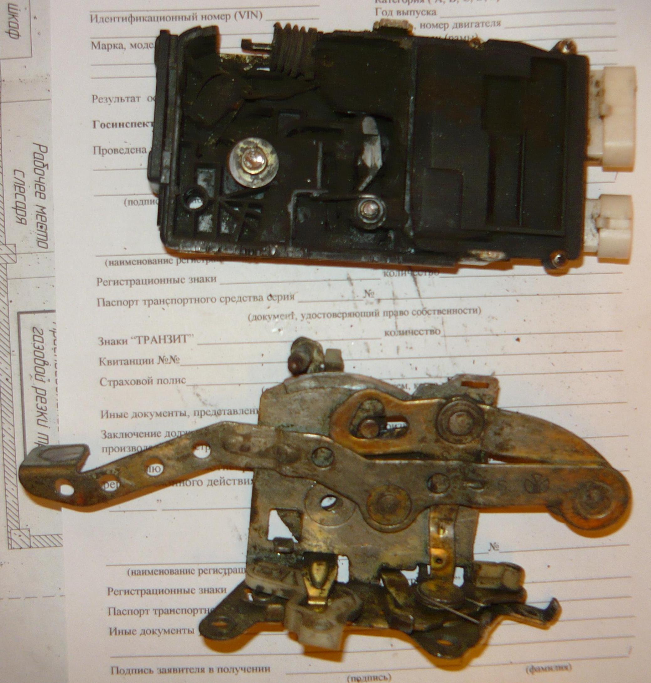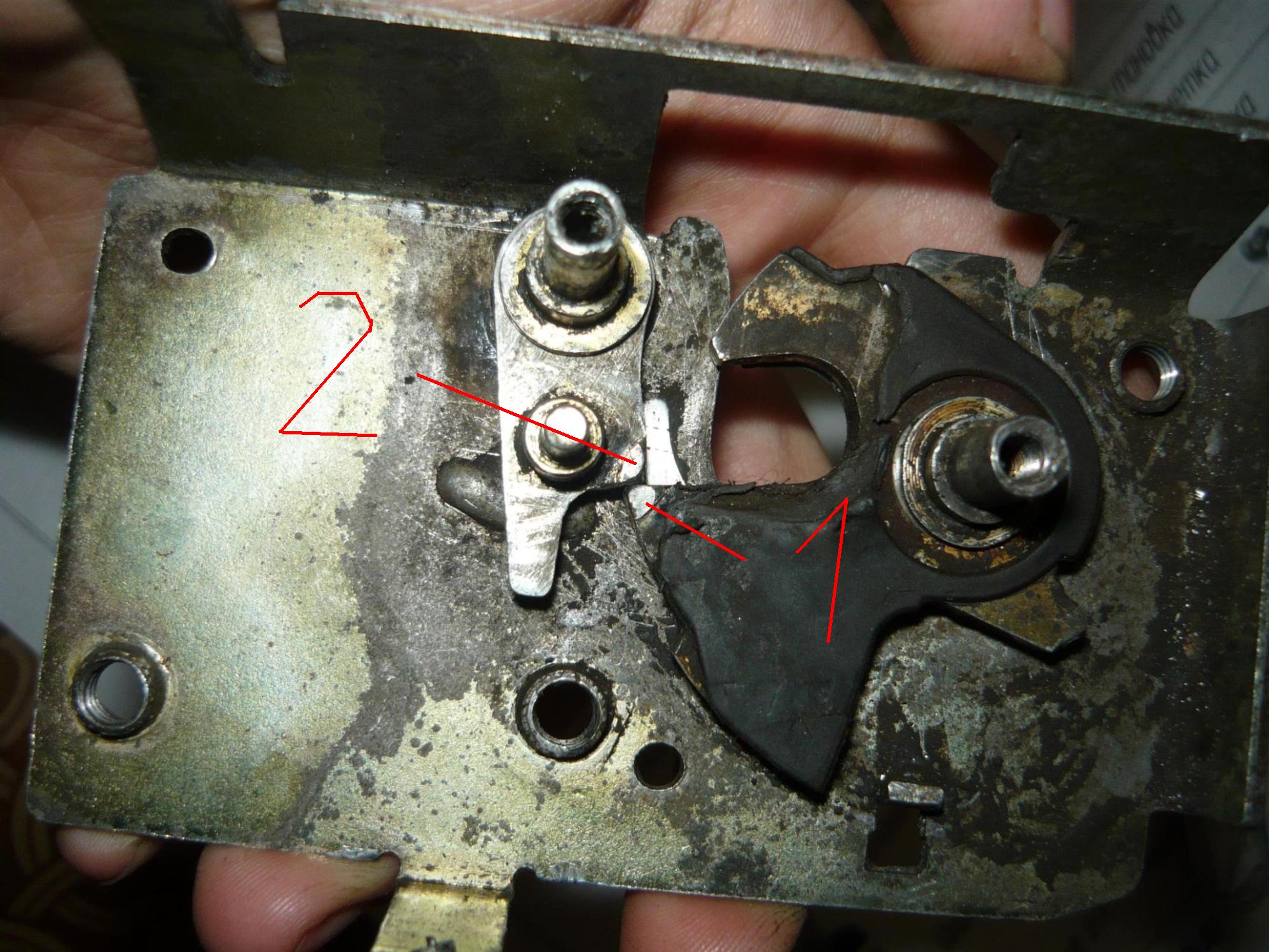 | Еще были изношены дет. 1 и 2, из-за этого дверь при закрытии отскакивала назад, а при езде открывалась на один щелчок, если не нажмешь на кнопку блокировки дверей сверху. Нужно наварить металла на кончики и обточить. |