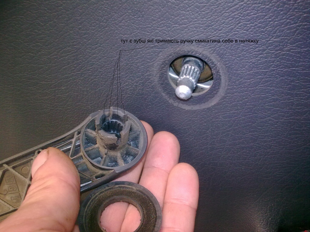 вороток висмикується встав пластину в зазор між обшивкою і воротком з двох боків або схопи пальцями по кругу втиснувши обшивку і в натяжку тягни -вороток вискочить[/img]