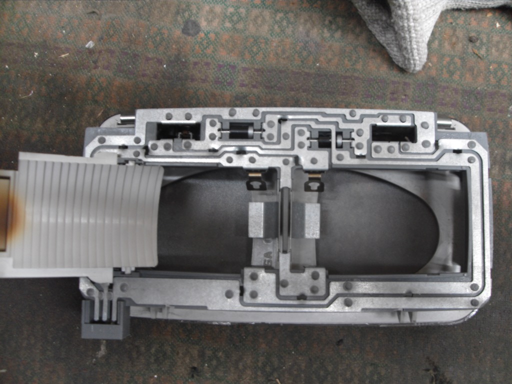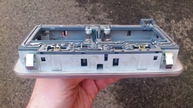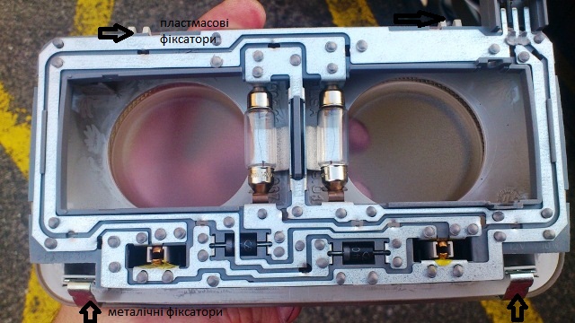 | Вид зверху. Стрілками вказані фіксатори. Металічні потрібно відігнути, щоб зняти світильник. Видно лампочки, якими освітлюється салон Нуово Добло. |