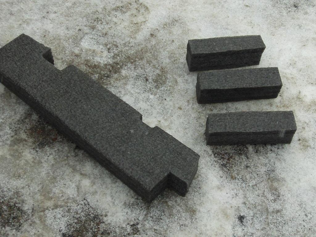 Из упаковки телевизора канцелярским ножом нарезал заготовки. Материал листовой 4х слойный напоминает чем-то Tubex (утепление трубопровода). Воду практически не впитывает и довольно мягкий. Мой друг по аналогии использовал обрезки пенопласта,но он тверже.
