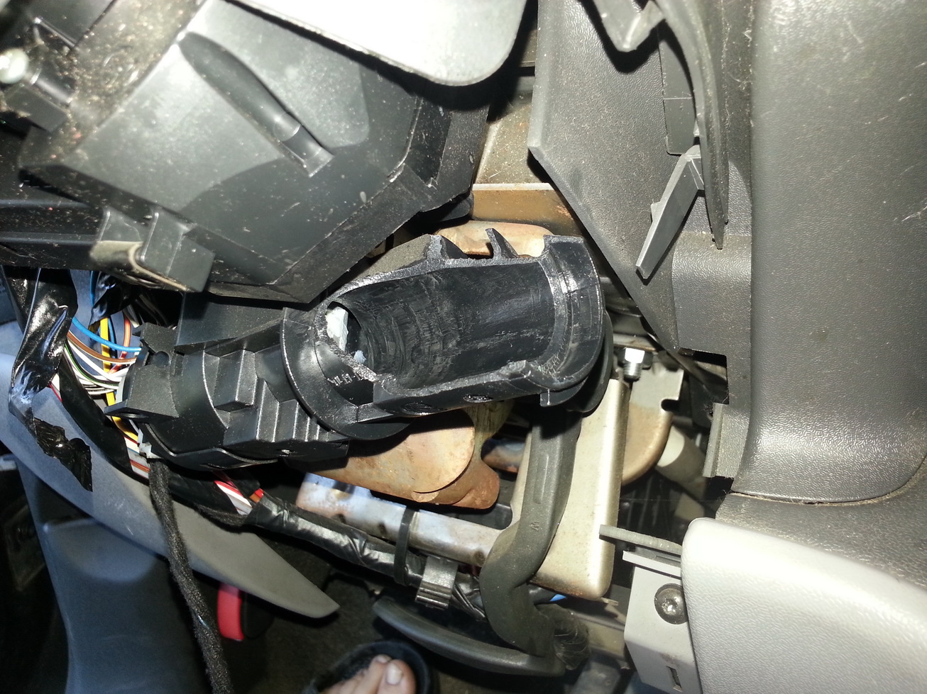 Для того щоб зняти замок потрібно: 1. Зняти мінусову клему з "батарейки". 2. Зняти декоративний кожух під кермом. 3. повернути ключ (ввімкнути запалення). 4. Натиснути викруткою на фіксатор (вказано на фото). 5. витягти замок.