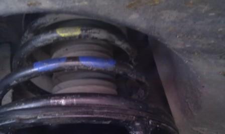 Дороги у нас такие как и везде по Украине.Но через месяц сделаю фото и увидете що витки не достают один другого бо там много запаса растояния между витками.Вот фото пружины по нагрузкой авто,растояние между отбойником 3см + 3см на сжатие отбойника=6см ход стойки вниз.Разьве на фото не видно что запас между витками намного больше.