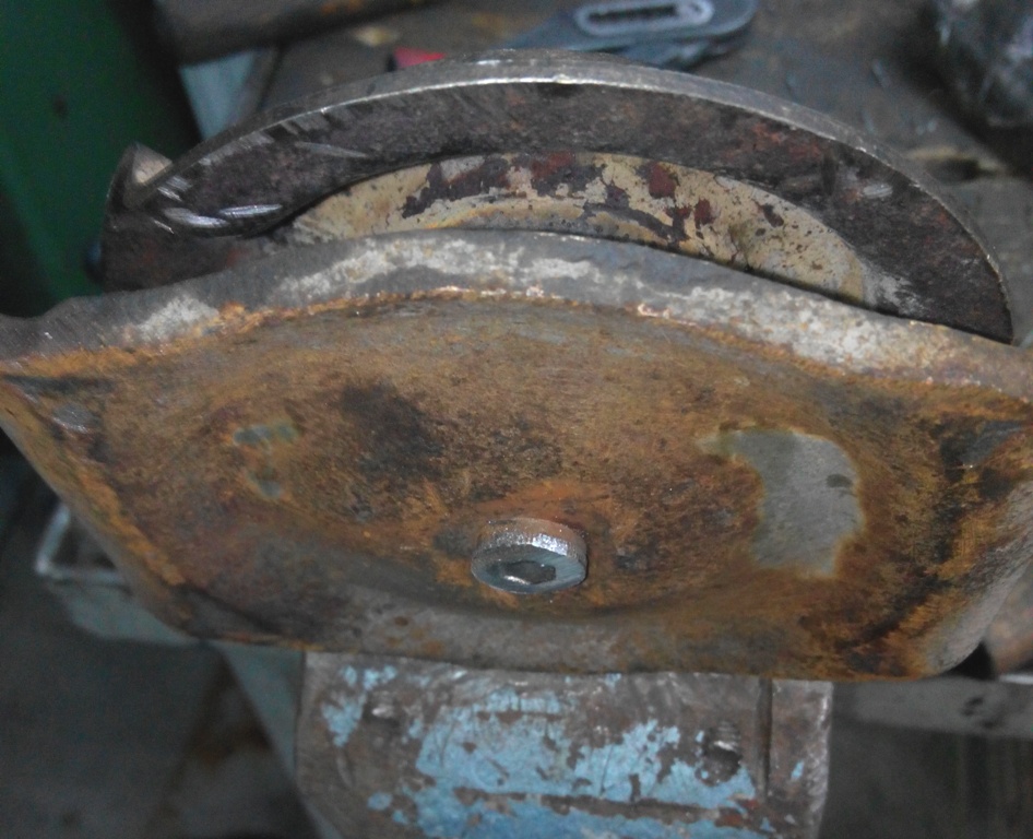 На рессоре есть выштампованное несквозное отверстие. Оно как раз по диаметру подходит под головку нашего болта (поэтому именно такой я и советую). Вычищаем его от ржавчины и наша пластинка с болтиком станет туда идеально, а главное по центру. Отверстие в нижней пластине я сверлил 10мм, чтобы если что, по месту можно было ослабить гайку и подвигать чашку относительно пластины (если вдруг на глаз ошиблись с просверливанием отверстия Very Happy ).