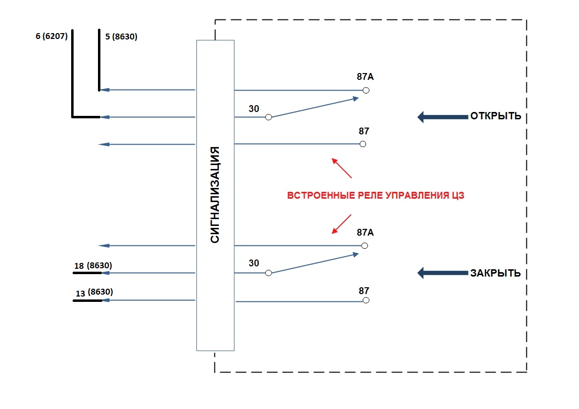 dfx,мне хватило провода 18(8630) Его пришлось разрезать и подключить к нормально замкнутым контактам отпирающего реле, а нормально разомкнутые контакты запирающего реле подключены один на массу 13(8630), а второй на 18(8630) после разрыва провода.