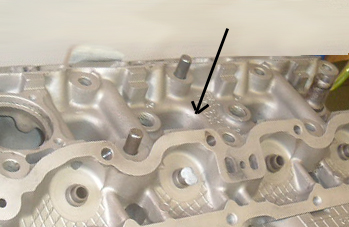 Имеется небольшая трещина в Головке блока цилиндров длиной примерно 1,5 см в районе 2-й свечи. Через эту трещину на холодном двигателе просачивается антифриз и заливает свечу, на прогретом двигателе течи нет. Примерное положение трещины отмечено стрелкой (головка чужая).