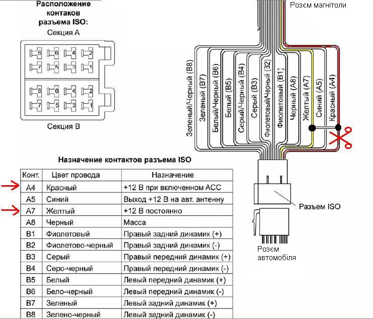 Відповідно, методом "тика" попробувати замкнути ті два (черв+жовт з магнітоли) на той, де постійний "+"!!!