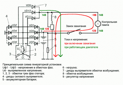 Ты абсолютно НЕ ПРАВ!!! Учи матчасть и не вводи в заблуждение других! На твоей же схемке КРАСНЫМ как раз и указана цепь возбуждения генератора! А уже потом, после того как машина завелась и возбудился генератор - ЗЕЛЁНАЯ цепь. Эти генераторы возбуждаются не от "чистого плюса", а через лампочку/резистор. А у Тазиков генератор возбуждался "чистым плюсом", а контрольная лампочка работала от рэле...