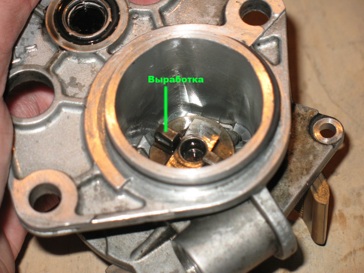 Ітак , вертаємось до наших баранів. Сьогодні превіряв роботу своєго вакуумного насоса, він справді тягне слабо. Нормальна тяга з"являється десь при 2000 об/хв в той час, як у справного насоса така тяга є відразу. Також виявиявилась виробка. Подаю відео і фото. http://www.youtube.com/watch?v=EhLQCEOktlU