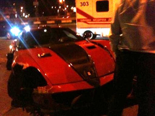 | Evgenius писал(а): | В ночь с пятницы на субботу в Киеве произошла авария стоимостью полмиллиона долларов. Водитель дорогого "Феррари" не справился с управлением и врезался в столб, когда на огромной скорости мчался от станции метро "Нивки" в сторону центра. По словам свидетелей, спорткар резко вильнул в сторону, после чего протаранил задней частью отбойник, переехал четыре полосы и врезался в осветительную опору. Сразу же после аварии на месте ДТП появились два черных джипа "Мерседеса" - так называемые "кубики". По всей видимости, это был кортеж сопровождения. Из "мерсов" выбежали крепкие ребята и помогли водителю "Ферарри", а также его спутнице покинуть автомобиль. За рулем итальянского шедевра был молодой мужчина – ему около 35 лет. На нем была черная куртка и светлые брюки. Во время удара он рассек себе лоб.