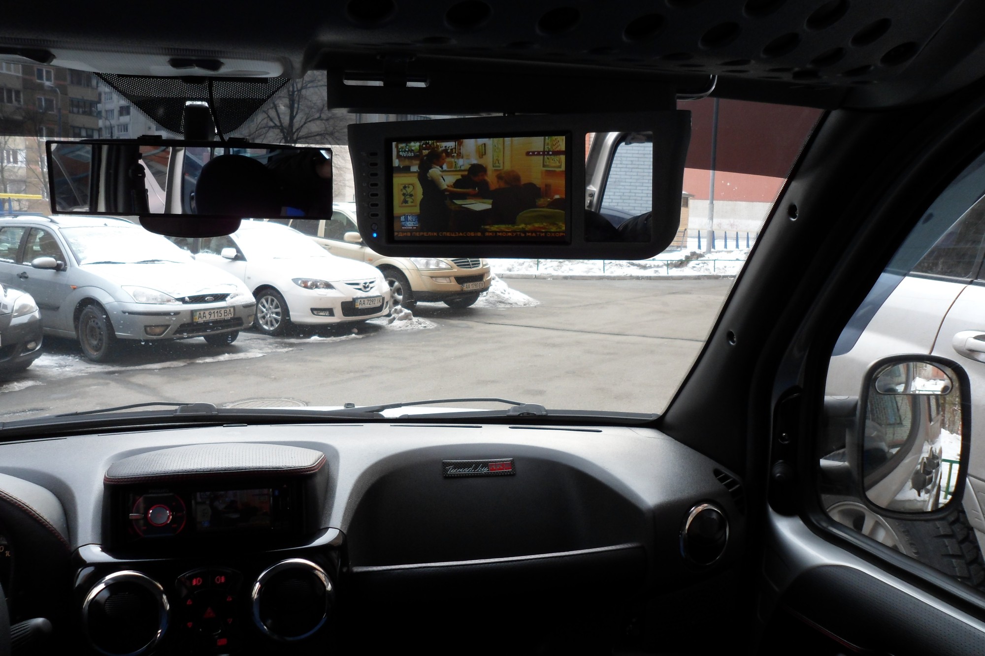 По поводу козырька - если на водительский повесить, хорошо камеру видно, но в дороге фильм включить посмотреть (езжу на Москву иногда) - будет мешать, а если на пассажирский - то наоборот. У нас же они не поворачиваются по вертикали. Магнитола - "золотая серединка"