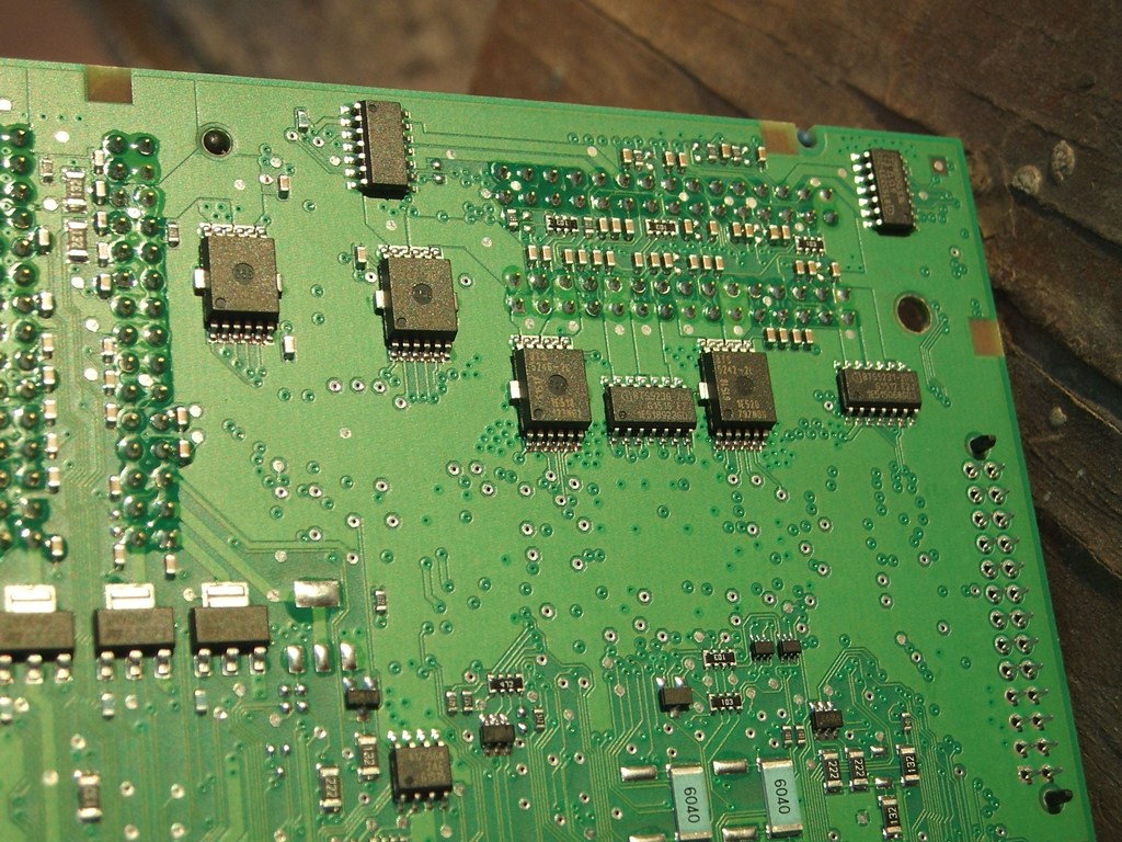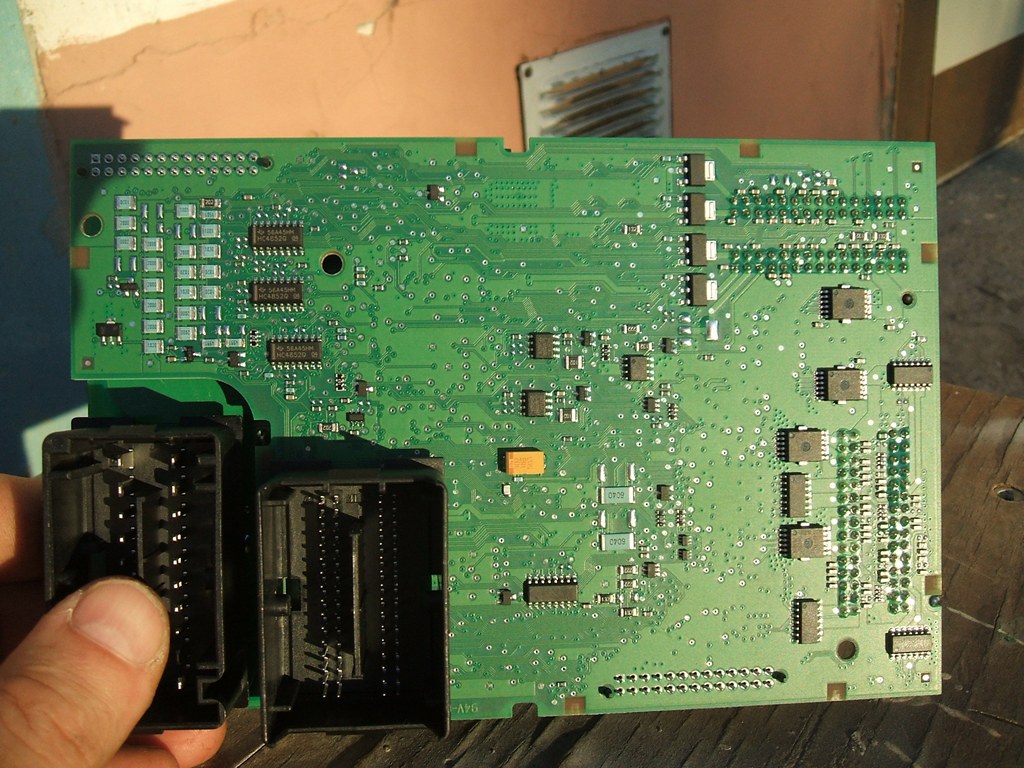 С "холодной" диагностикой разобраться относительно просто: на фото под разъёмом, окружённом BTS-ками, видны резисторные сборки по 10 кОм, и несколько одиночных резисторов. Через всех них проходит одна общая дорожка -- это и есть сигнал "холодной" диагностики, на нём постоянно присутствует меандр 100 Гц. И далее через каждый из вот тех резисторов подаётся на свою цепь лампочки. Перерезаем дорожку, где можем, где не можем -- выпаиваем резисторы, и вот оно! Эту фичу убрали.