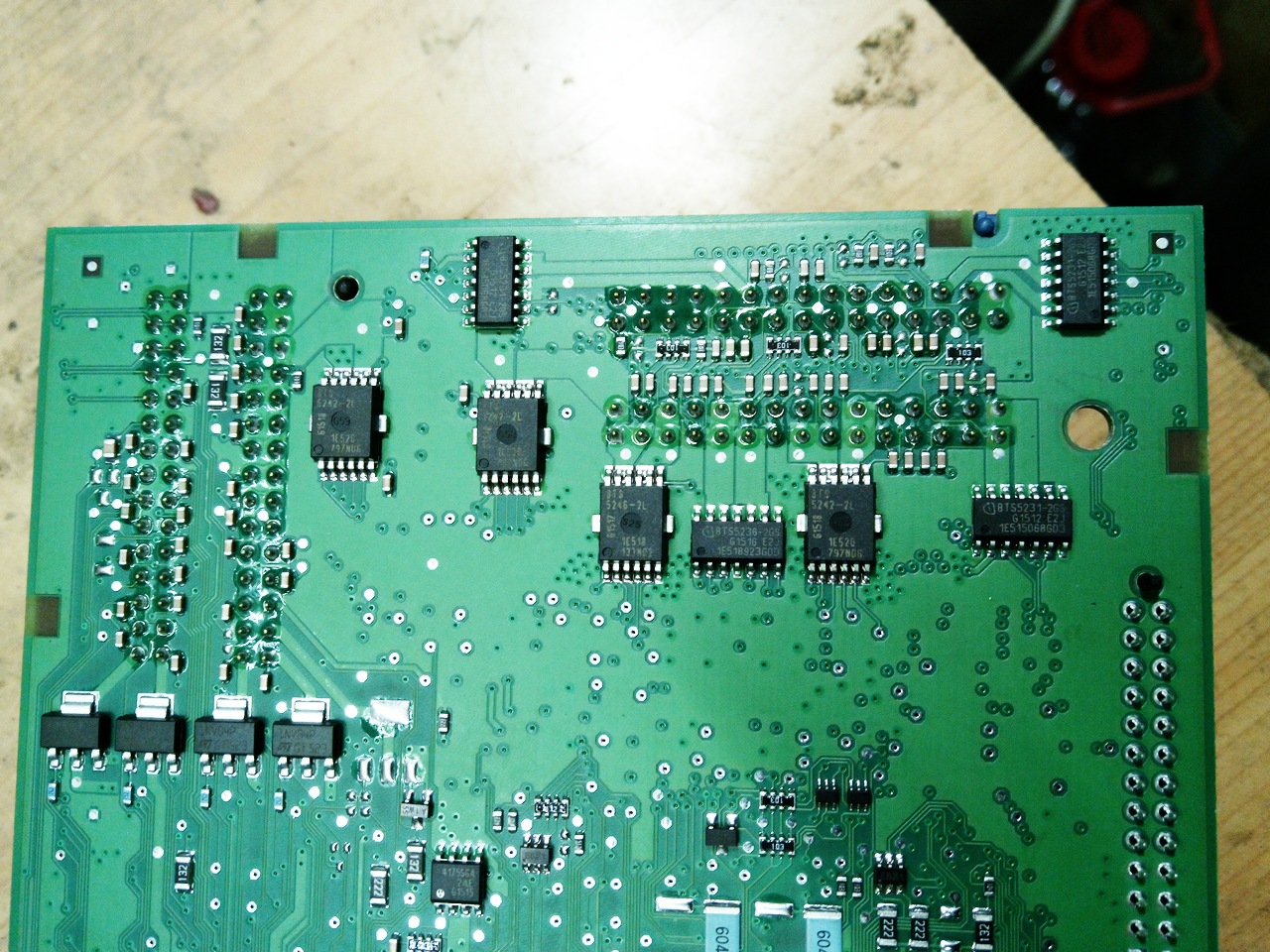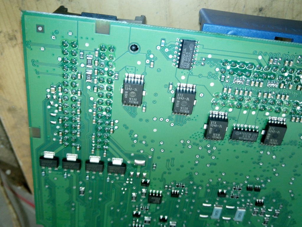 Итак. Где-то внутри -- микроконтроллер. Но то что нам больше всего нужно -- релюшки и электронные силовые ключи -- вроде как на поверхности. Явно видны микросхемы "BTS5231", "BTS5236", "BTS5242", "BTS5246" -- все они легко гуглятся. Каждая из них -- это двухканальный "интеллектуальный выключатель" на MOSFET, верхнее плечо. И содержат те самые детекторы "неправильности" нагрузок, которые нам необходимо задушить.