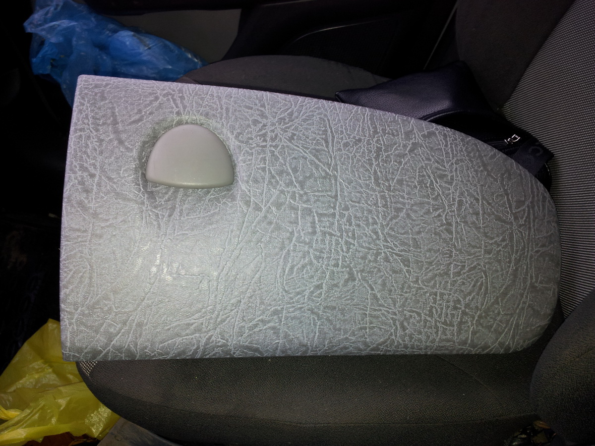 Если честно, то хотел только затянуть подлокотник на сидушке, так как протёрлась ткань. И случайно находясь в магазине стройматериалов наткнулся на кожвенил для обтяжки входных дверей за 37,59 грн за квадратный метр. Заделал подлокотник, понравилось! Решил попробовать бардачёк так как очень покоцаный был (вот фото бардачка до и после).