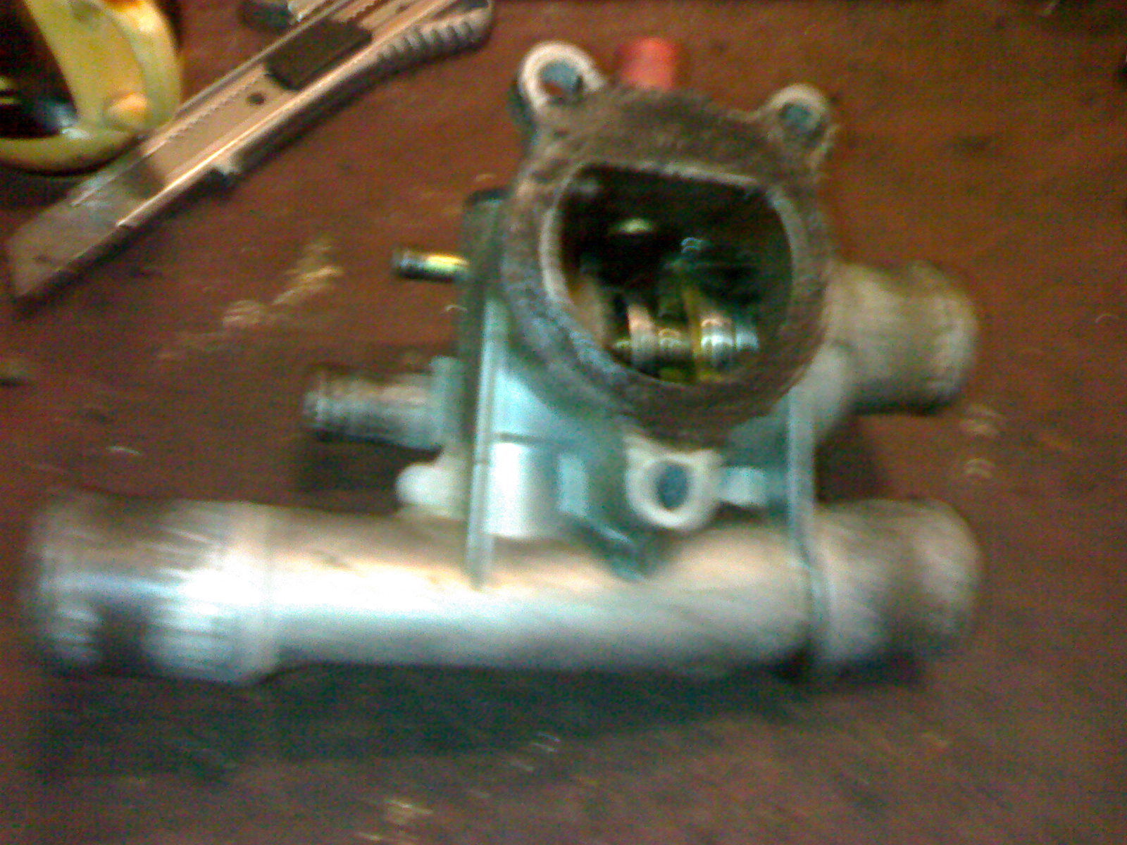 С трудом был разобран термостат.Я зажимал корпус термостата в тисках (старался не сильно, корпус алюминиевый), газовым ключом брался за шестигранник и откручивал (пробовал на двух термостатах, на обоих удалось, главное сорвать, там герметик какой-то твёрдый нанесён). Дальше всё в принципе видно. Выбросив все внутренности видно буртик (ступеньку), под него точилась шайба (где-то на фотках видно), в шайбе делалась проточка для резинового кольца (заранее было куплено кольцо и термостат). На термостате надо убрать выступ по наружному диаметру (напильником пару раз шморгануть). Выточено металлическое колечко с небольшой выемкой для установи резинового кольца и куплено резиновое кольцо. В корпус термостата вставляется металлическое кольцо потом резиновое, элемент термостата и закручивается гайкой термостата (при сборке всё промазывал слоем герметика).