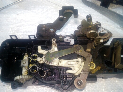 разбераим все, чистим, смазываем шестеренки салидолом. нужно хорошо промыть язычек замка бензином очень старательно, после этого язичек должен сам отскакивать. собераем все назад, правда нужно теперь придумать новую заклепку.
