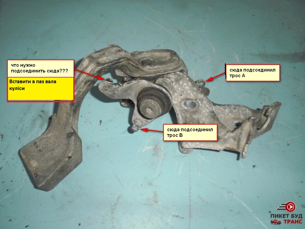 Стал разбираться почему и обнаружил ,что трос В,который идёт на Г-образное коромысло и как раз отвечает за выбор переключения передач ,ничего неделает,т.к. я неподсоединил второе шарнирное соединение "яблочко"на этом Г-образном коромысле .Подскажите пожалуйста ,что и от куда должно подсоединяться на это соединение.Фото кронштейна с своими пояснениями прикрепил ниже.Спасибо за помощь.