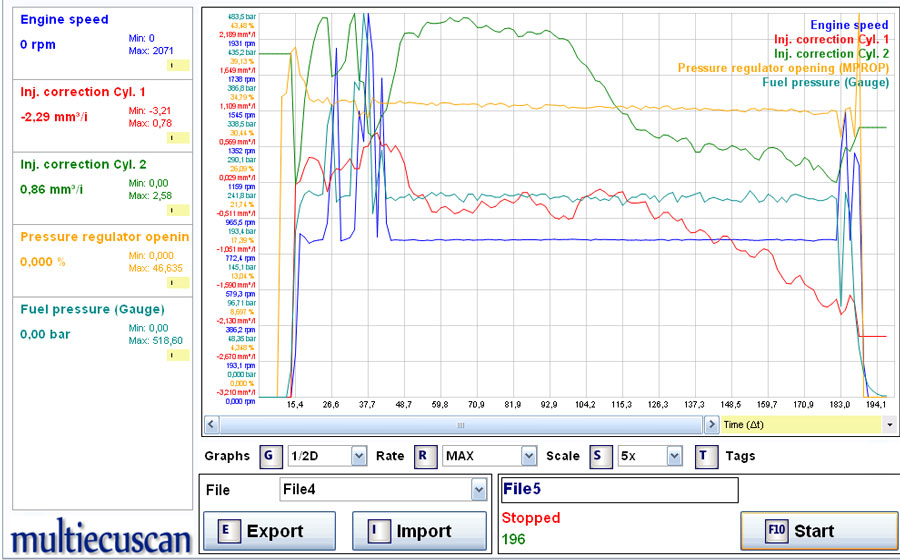 Якщо не помилився у графіку тиск у рампі на холостих у районі 240-250атм.Це за мало,коли знижується нижче 180 ЄБУ вимикає ДВЗ.За тиск відповідає регулятор тиску на ПНВТ,ще може бути що насос ПНВТ не може підтримувати потрібний тиск.Думаю на сервіс для консультації.