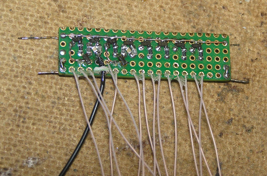 Платка припаяна ножками прямо к верхней заливке основной платы. Там как раз +12, а "землю" пришлось брать с пина одного из невпаянных транзисторов. Тонким МГТФ-ом сделаны подвод и вывод сигнала. Пока подключил только канал DRL. Там как раз самый сложный вариант, с этими вот 100 герцами постоянно. Дорожки с входными сигналами к BTS5246 порезаны, от них на вход повторителя и одновибратора на плате, а с платы -- уже на входы драйвера, и на выходы его диагностики. Пришлось, правда, по месту подобрать резистор "обмана", получился 10кОм.