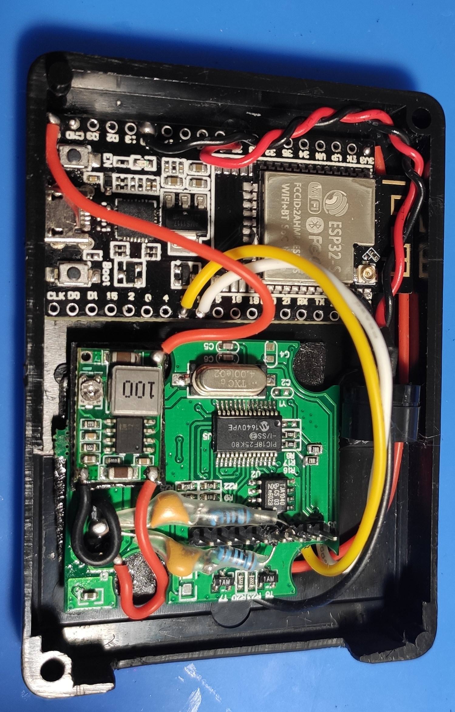 Ідея проста: замість Bluetooth модуля BK3231 підпаюємо ESP32 DEVKIT і у нас з’являється ELM327 із можливістю підключення по USB, WIFI, Bluetooth, а також наскрізним моніторингом команд, що йдуть до ELM327 і навпаки. Також можемо в терміналі (моніторі порта) руками вводить команди. Підключення TX ELM327-RX ESP32, RX ELM327-TX ESP32, земля спільна, живлення ESP32 через окремий понижуючий DC-DC перетворювач 12В-5В, оскільки в ELM327 лінійні перетворювачі дуже просаджували напругу і працює нестабільно. В пікі ESP32 по WIFI бере до 200mA. Прошиваємо скетч в ESP2.