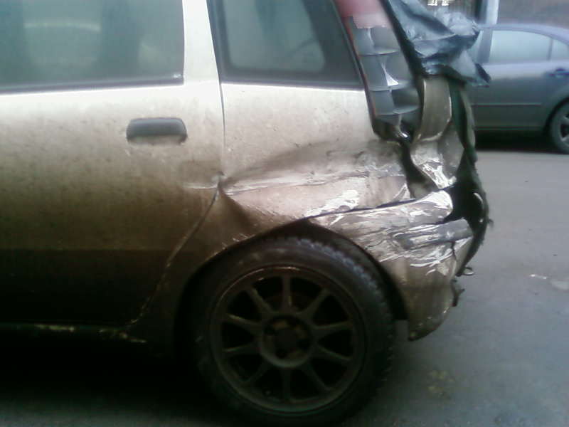 Попал в аварию на трассе – удар пришёлся в левое переднее крыло, затем в левое заднее. Из повреждений – передние крылья, бампер, фары, капот, левая передняя чашка – треснула по сварочному шву, правая чашка возможно тоже немного ушла из-за растяжки. Сзади – правое заднее крыло, задний бампер, крышка багажника, стекло багажника, левая задняя фара, возможно ушла левая задняя чашка.