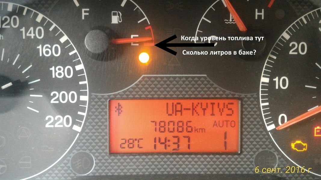 Пришлось сегодня машину гнать от завода Кока-кола в Вишневое, только отъехал загорелась лампочка, в Киеве уже начала пищать, денег на заправку нет, кароче доехал, уровень на фото. И вот возник вопрос, а сколько литров остается когда стрелка падает как указано на фотке ?