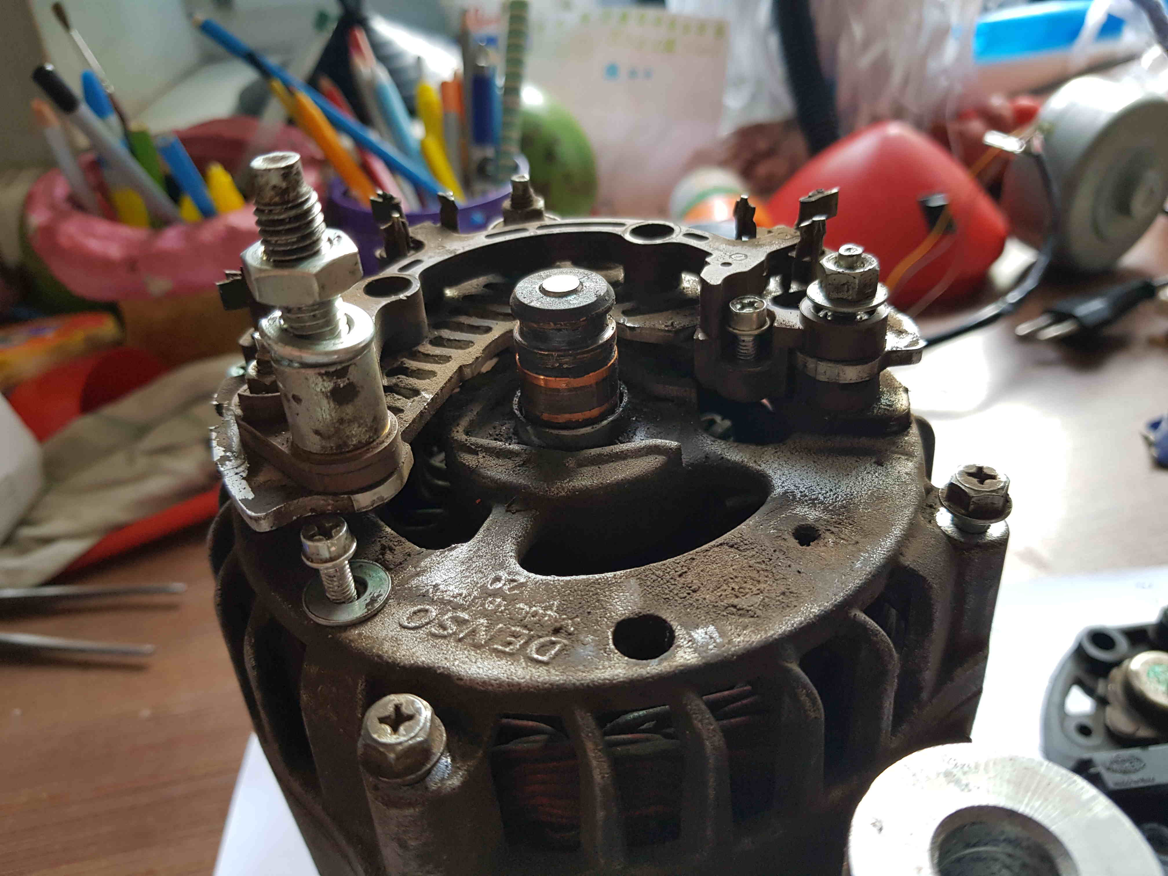 Из за большой занятости местных мастеров и острой необходимости быть на колёсах решил отремонтировать генератор своими силами. Необходимо поменять втулку с токосъёмными кольцами и щетки. Боковую крышку снял, блок с щётками открутил.