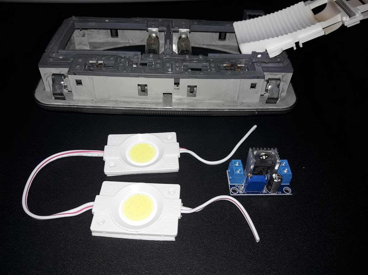 Вот взял набор для рэинкарнации водительского светильника салона . Два светодиода мощностью 2,4 Вт и электронную плату стабилизации LM-317 DC-DC напряжения на 12 вольт.