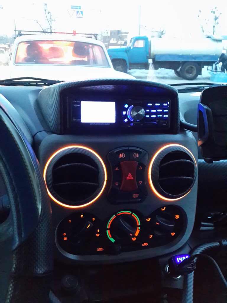 Есть масса цветов, каждый может подобрать себе по вкусу. Он бывает разной толщины, от 0,9мм. Но главное, есть не круглого сечения, а кругляк со "шлейфом" как бы, чтобы этот шлейф можно было всовывать в стыки пластика торпеды, к примеру. Как раз, "автоколхоз вариант" . Я выбрал оранжевый, понятно почему. По факту разным цветом он светится за счет окраса оболочки. Сама светящаяся жила светит белым с голубизной. По глазам не бьет. Мне очень нравится, всем кому фастаюсь - тоже . Его можно резать на любой длины кусочки и спаивать, правда работать приходится "ювелирно" (смотрим видосы в ютюбе). Пищащий блочек подключил к лампочке подсветки печки, там же внутри его и расположил. Слышно только при заглушеном движке в абсолютной тишине. Собсна фоты.