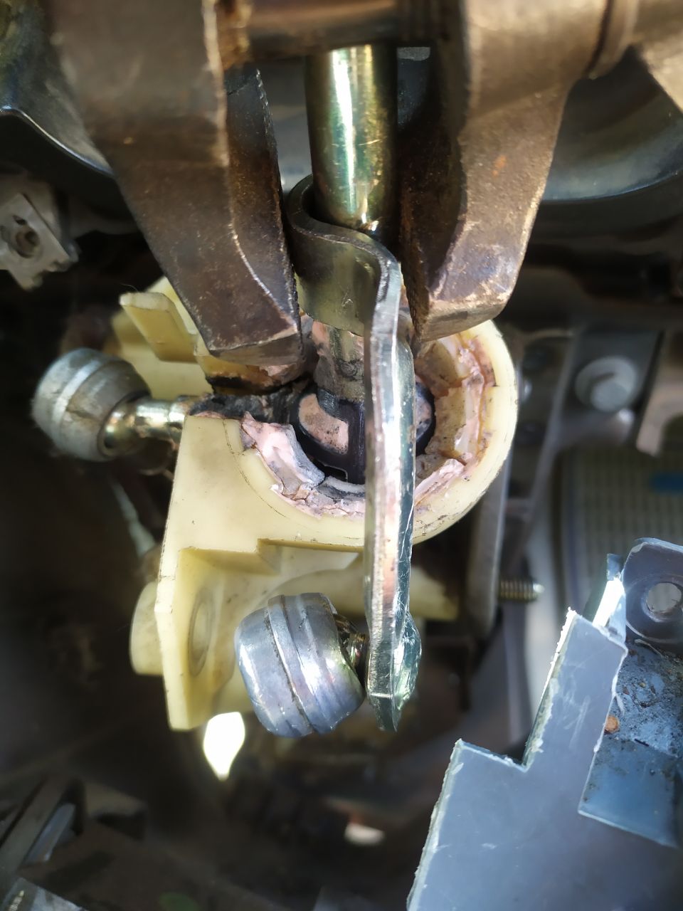 Корпус, где стоит рычаг? Да, вроде ок, все целое. Может трос надо провернуть как-то трос против часовой по оси, и надеть наконечник в этот "сустав", чтоб не выскакивал? Или как закрепить или уплотнить? Меняется ли этот наконечник, который на тросу?