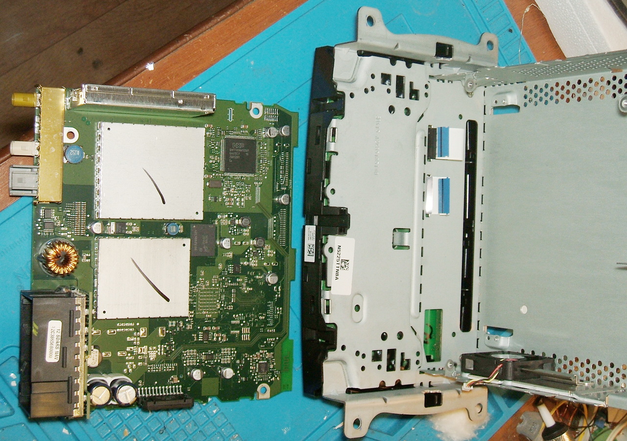 Идентификационная табличка на радиомодуле, и усилитель мощности. Вопреки "элементарной логике" -- раз есть внешний усилитель, то из "головы" выходит линейный уровень -- довольно мощная микросхема тут есть! Но, оказывается, TDA7563A -- это такая ужжжасно умная микруха, которая общается с процессором по I2C, отдаёт ему диагностику всего что только можно придумать, и ещё исполняет команды от хоста. В том числе, есть режим "линейного выхода" -- малое усиление всего в 12 дБ. Видимо, базовый агрегат универсальный (для всяких Доджей и прочих Джипов), и он сам определяет, включать ли ему мощный выход или "линейный".