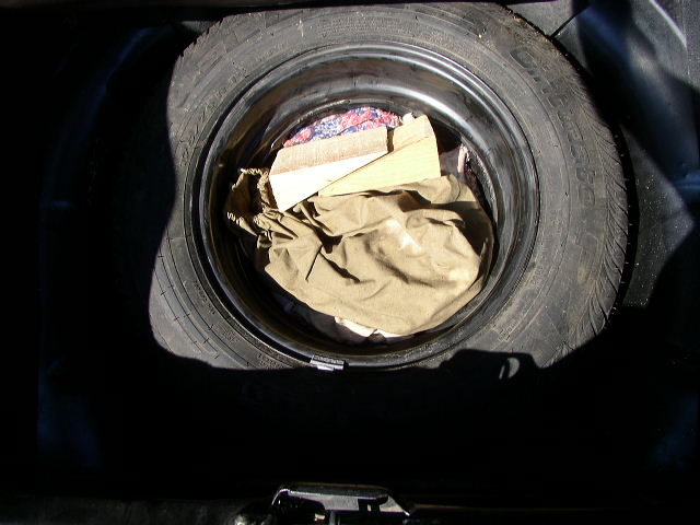 И исчо одно.Но сначала преамбула. Не часто,но проходится доставать домкрат,причем даже не для смены колеса.И каждый раз вынимать колесо...Я его перевернул,закремил болтом покороче,все лахи- в мешок,а сверху все крышкой из первой попавшейся хванёры толщ. 10 мм. Сегодня доставал домкрат без мата...