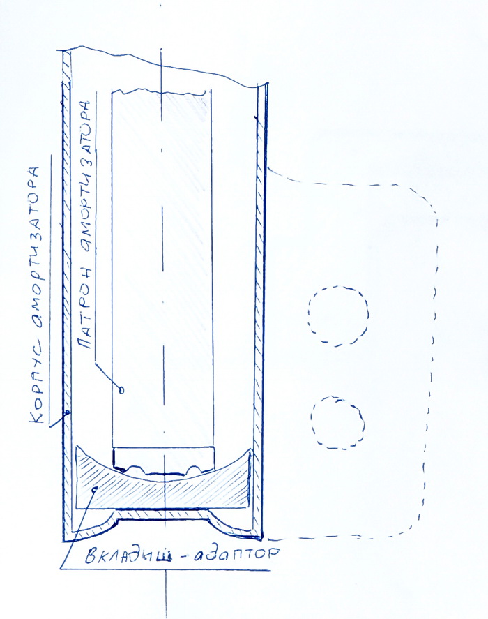 Заправленный современный патрон в оболочке не входит по диаметру в старый корпус, поэтому много лет применяют второй способ . Покупаем подходящий патрон, если он запечатанный в оболочке (с маслом) - аккуратненько вскрыть (токарь это лучше сделает), вынуть из оболочки, маслице слить про запас. На период примерок голый патрон обернуть упаковочным поэлителеном, чтобы в клапана не попадал мусор и металлич . стружка, это очень важно. Старый родной аммик аналогично вскрываем, и используем только его корпус. Вставляем новую начинку в старый корпус, смотрим, как центрируется низ, если сидит хорошо, то отлично, а если перекашивается и не имеет устойчивого положения, то надо токарю выточить вкладыш-адаптор (рис 0-0), который размером чуть меньше внутреннего диаметра корпуса (кладется на дно корпуса, правильно сопрягая профили дна и торца амортизаторного патрона). Лучше делать так, чтобы этот вкладыш всегда можно было удалить из корпуса, на случай если будете потом использовать патрон другого производителя, он может отличаться по высоте или посадке, тогда вкладыш можно сделать новый.