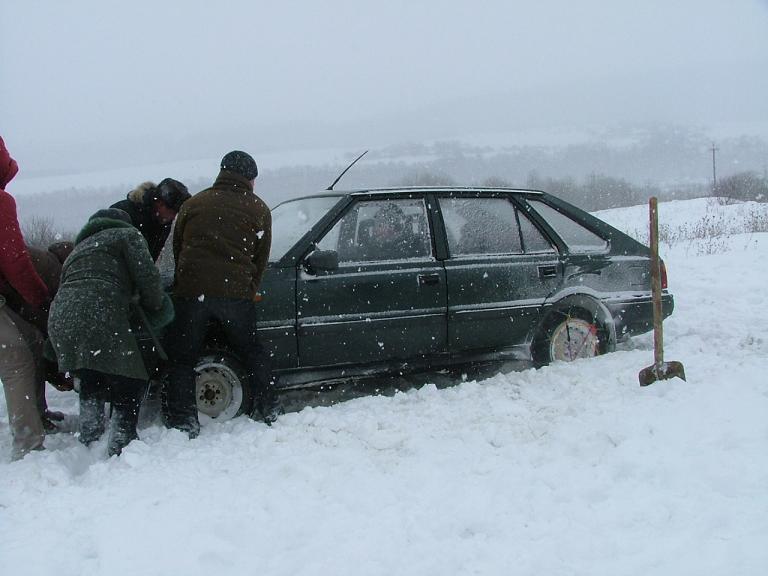 Поехал на выходных к бабушке в село. В суботу снег не падал - но был очень сильный ветер и с полей на дорогу надувало очень много снега. Потом целую ночь падал снег + ветер. И целое воскресенье тоже падал снег + ветерь. В деревню никакой грейдер не ездит и никогда не ездил. В 12 чесов дня я собрался домой. А чтобы выехать из села нужно проехать горку гдето градусов 60 к томуже с поворотами. Сверху снег, под снегом льод.