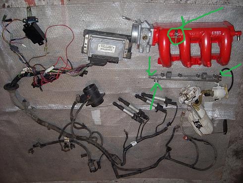 тэкс... в ресивере отверстие под датчик темп. воздуха, трубочка- хз под какойта вакуум, если нинужна- глуши просто. С другой стороны ресивера- тож какие-то вакуумные трубочки, у меня к ним подключен эконометр и регулятор давления топлива. в рампе- тоненькая трубочка- к ресиверу, для регулировки давления, а 2 толстые- подача и обратка, что где- разберись сам, у меня другая рампа....